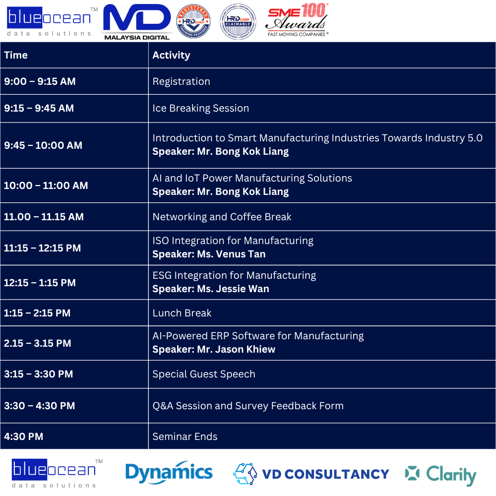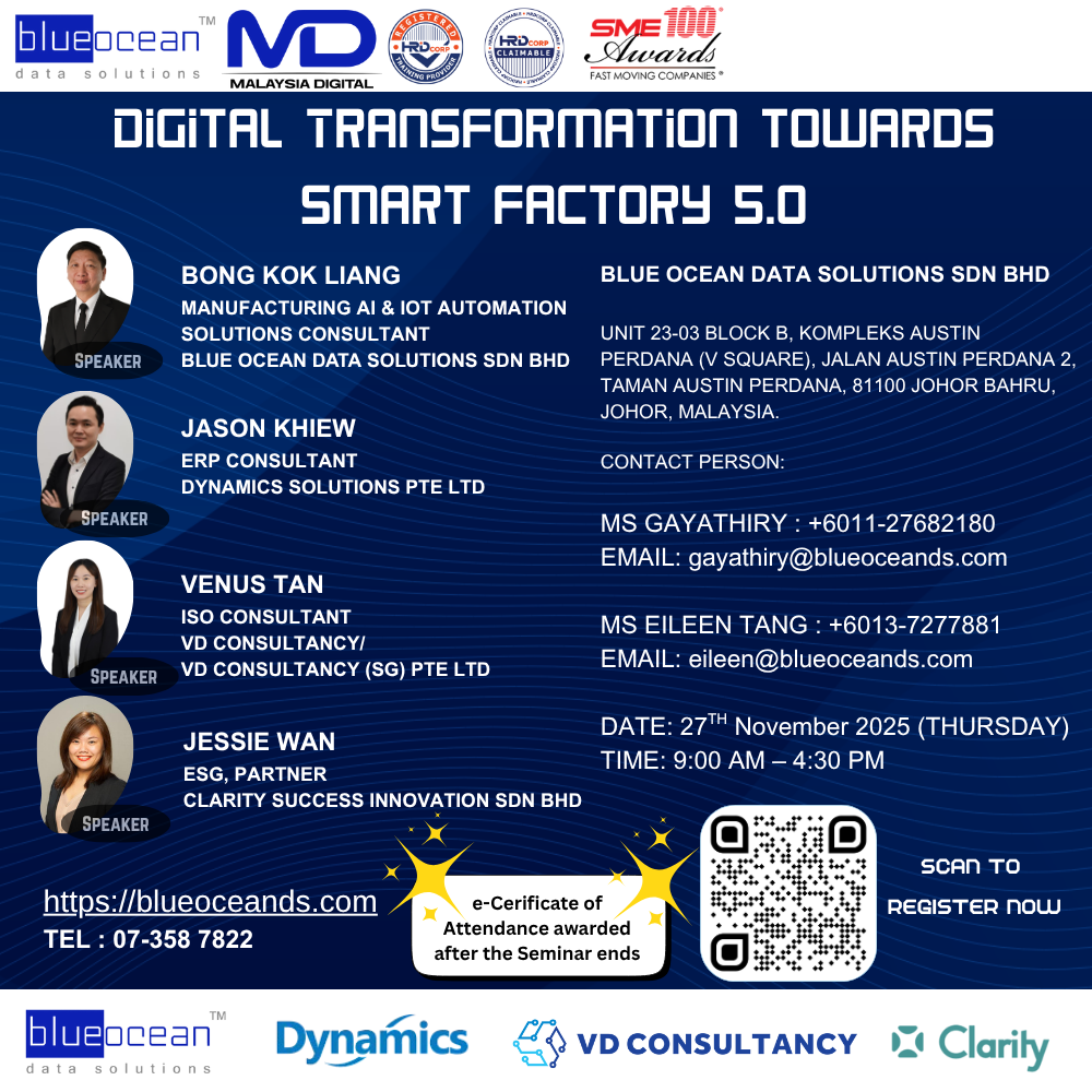 Digital Transformation Towards Smart Factory 5.0 | Date : 27th November 2025 Time: 9.00 am to 4.30 pm Venue: Unit 23-03 Block B, Kompleks Austin Perdana (V-Square), Jalan Austin Perdana 2, Taman Austin Perdana, 81100 Johor Bahru, Johor, Malaysia. Contact: Ms. Gayathiry: +6011-27682180 | Email: gayathiry@blueoceands.com Ms. Eileen Tang: +6013-7277881 | Email: eileen@blueoceands.com Register Here |